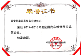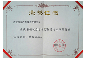 2015年 11 月,恒泰榮獲“中國汽車維修行業誠信企業”稱號;